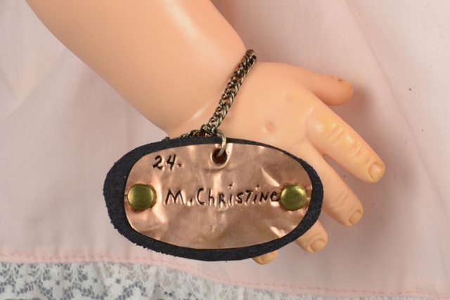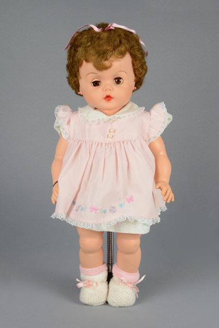 Poupée aux cheveux bruns courts vêtue d’une petite culotte blanche, d’une robe blanche à motifs floraux bleus, jaunes et gris au collet bordé de dentelle blanche, d’un surtout rose à bordure de dentelle blanche avec des motifs floraux brodés au bas et deux petits boutons blancs à la poitrine. Elle porte des chaussures en tricot blanc avec des petits rubans roses et des bas roses. Elle porte des boucles d’oreille roses. Elle a une petite boucle rose retenue dans les cheveux par une épingle. Les yeux peints en brun, blanc et noir se ferment lorsqu’elle est couchée. Les lèvres sont peintes en rose. Elle porte au poignet droit un bracelet avec un médaillon de métal et de cuir.