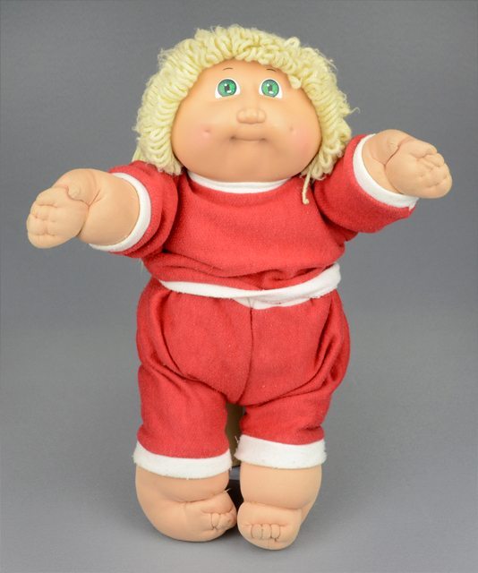 Poupée aux cheveux blonds coiffés en tresse. Elle porte un chandail de molleton rouge bordé de blanc. Elle porte un pantalon de la même matière. Le corps est constitué de tissu rembourré. Les yeux sont peints en vert, blanc et noir.