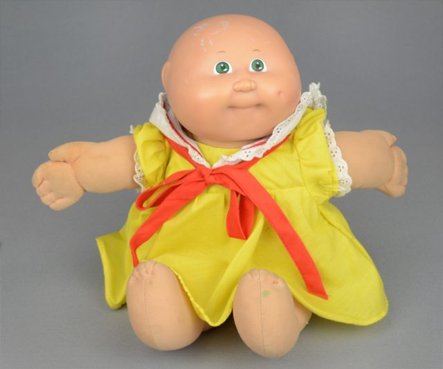 Poupée sans cheveux. Elle porte une robe jaune bordée de dentelle blanche au collet et aux bas des manches. Une grande boucle rouge est fixée sous le collet et se noue à l’avant de la robe. Le corps est constitué de tissu rembourré. Les yeux sont peints en vert, blanc et noir.