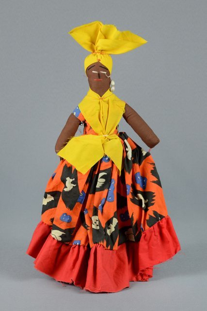 Poupée faite de divers tissus rembourrés. Elle porte une robe orange à motifs de citrouilles, de fantômes et de sorcières et à la bordure rouge. Le corps est fait de tissu bleu marin à pois blancs. Elle porte au cou un châle jaune. Elle est coiffée d’un foulard noué sur la tête. La tête, les bras et les jambes sont en tissu brun. Les traits du visage sont faits de fils noirs, blancs et rouges.