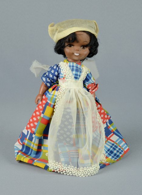 Poupée à la peau foncée aux cheveux noirs. Elle est coiffée d’un morceau de tissu blanc semi-transparent, d’une robe à carreaux bleus, rouges, ocres, verts et blancs. La robe a aussi des motifs de fleurs blanches. Le tablier est blanc en tissu blanc semi-transparent. Sous la robe, elle porte un sous-vêtement blanc orné de dentelle. Ses yeux en brun, blanc et noir se ferment lorsque la poupée est couchée. La tête, les bras et la jambe gauche sont articulés. Il manque la jambe droite.