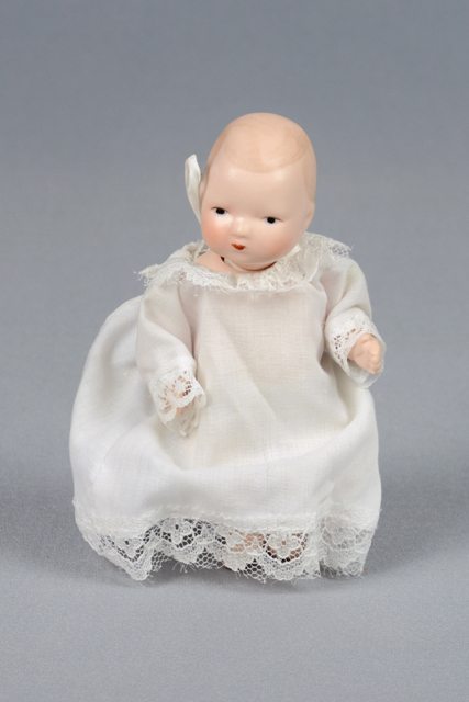 Poupée d’un bébé dont le corps, les membres et la tête sont fabriqués en porcelaine et glacés en beige. Les cheveux sont peints sur la tête en brun pâle. Les lèvres sont peintes en rouge et les yeux en bleu. La poupée est vêtue d’une robe de nuit en coton blanc bordé de dentelle au bas, au cou et au bas des manches. La chemise de nuit est ouverte à l’arrière et s’attache grâce un petit ruban à la nuque. Une épingle de sûreté dorée est attachée derrière la robe. La poupée porte une couche de coton blanc.