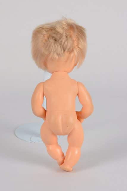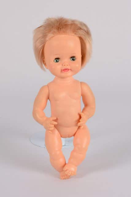 Poupée fille sans vêtement. Elle a les cheveux blonds courts. Ses yeux sont mobiles selon la position de la poupée. Les lèvres et la bouche sont peintes en rose.