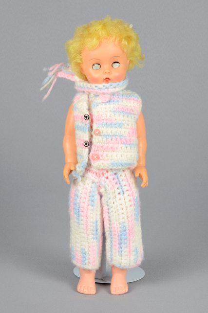 Poupée aux cheveux blonds courts. Elle porte des vêtements tricotés en laine de couleur blanche, rose et bleue dont une salopette, un foulard et une veste fermant à l’avant avec trois boutons-pression. La tête, les bras et les jambes sont articulés. Les yeux se ferment lorsqu’elle est couchée. Les lèvres sont peintes en rouge et les joues en rose.