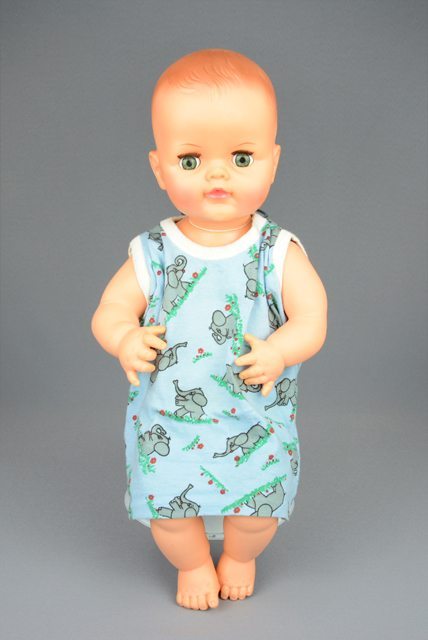 Poupée aux cheveux roux moulés et peints. Elle porte une robe bleue à motif d’éléphants gris, avec bordures blanches aux manches et à l’encolure. La tête, les bras et les jambes sont articulés. Les yeux se ferment lorsqu’elle est couchée. Les lèvres sont peintes en rose et trouées au centre.