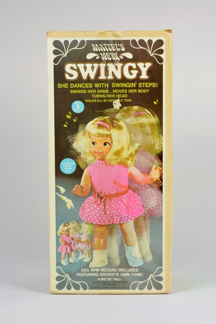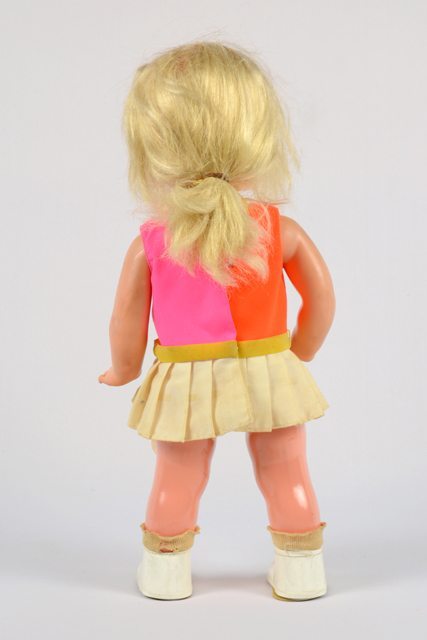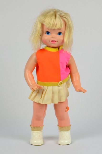 Poupée fille, aux cheveux longs blonds, aux yeux bleus peints, portant une robe orange, rose et blanche, avec une ceinture jaune sale, portant à ses pieds des bas blancs et des chaussures blanches. Il y a un emplacement pour des piles de format « C » dans le dos, sous le panneau amovible, et un sélecteur d’action à la nuque. Au genou gauche, une pastille orange est collée.