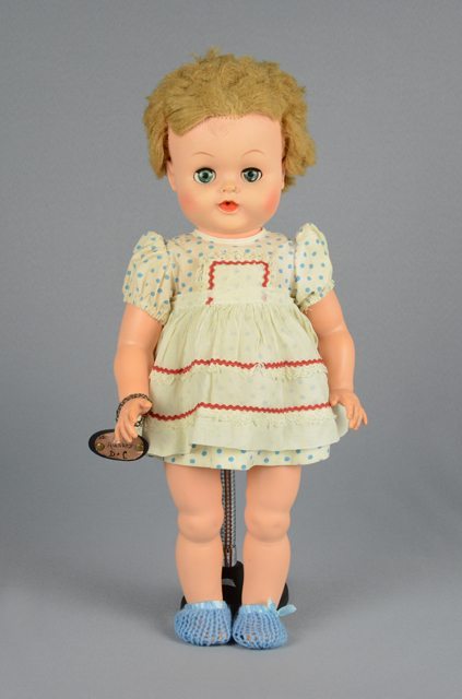 Poupée aux cheveux blonds courts. Elle porte une robe blanche à pois bleus avec un tablier blanc à bordure de dentelle blanche cousue à la robe. Elle porte une petite culotte en tissu blanc et des chaussettes en tricot bleu avec des petits rubans bleus. Les yeux peints en vert, blanc et noir se ferment lorsqu’elle est couchée. Les lèvres sont peintes en rouge. Elle porte au poignet droit un bracelet avec un médaillon de métal et de cuir.