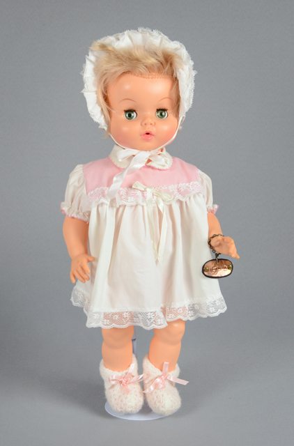 Poupée fille aux cheveux courts blonds. Les yeux en plastique bleu, blanc et noir se ferment lorsqu’elle est couchée. Elle porte un bonnet blanc orné de rubans roses et de dentelle blanche. Elle porte une robe blanche à la partie supérieure rose et ornée de dentelle blanche et avec trois petits boutons de plastique au dos. Elle porte une petite culotte blanche et des chaussons blancs à rubans roses. Au poignet gauche, elle porte un bracelet avec une petite plaque métallique.
