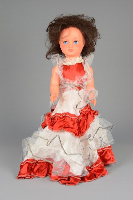 Poupée fille aux cheveux longs bruns avec une barrette en plastique verte. Les yeux se ferment lorsque la poupée est couchée. Les lèvres et les joues sont peintes en rose. Elle porte une robe rouge et blanche sans manches ornée de tulle avec une bordure dorée, au col de dentelle blanche et des souliers de plastique blanc. La robe est fermée au dos par des boutons-pression en métal. Les bras et jambes sont articulés. Les bras sont retenus par une bande élastique en caoutchouc dans le corps de la poupée.
