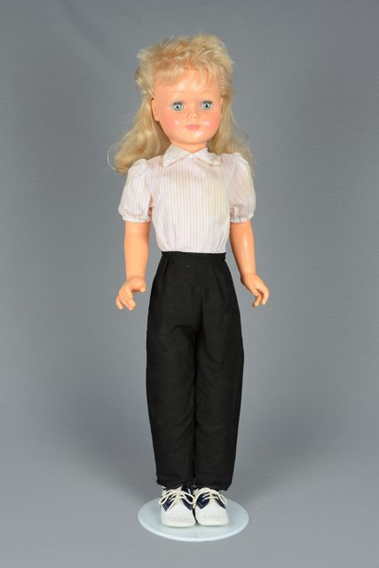 Poupée aux cheveux blonds longs. Elle porte une chemise blanche rayée verticalement en bleu et rose avec un col orné de dentelle. Un pantalon noir est cousu avec la chemise pour former un seul vêtement. Elle porte aussi des bas blancs, des chaussures en plastique blanc et bleu marin. La tête, les bras et les jambes sont articulés. Les yeux en plastique blanc, bleu et noir se ferment lorsqu’elle est couchée. Les lèvres et les joues sont peintes en rose.