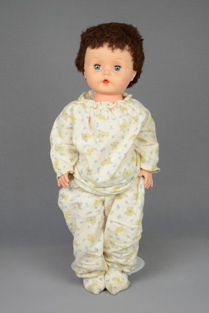 Poupée aux cheveux bruns, courts et bouclés. Elle porte un pyjama composé d’un haut, d’un pantalon et de chaussons, en coton peigné blanc à motifs d’oursons, d’éléphants, de poussins jaunes et de fleurs bleues. La tête, les bras et les jambes sont articulés. Les yeux peints en bleu, blanc et noir se ferment lorsqu’elle est couchée. Les lèvres sont peintes en rouge.