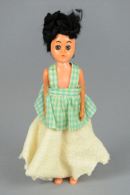 Poupée aux cheveux noirs. Elle porte un haut à carreaux verts et blancs. Elle porte une jupe de ratine blanc crème. La tête et les bras sont articulés. Les yeux se ferment lorsqu’elle est couchée. Les lèvres sont peintes en rouge.
