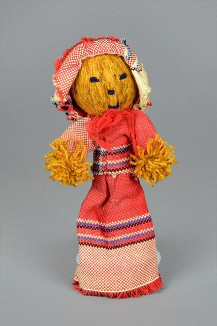 Poupée en fibre ocre (laine ?) ayant une boule de mousse de polystyrène recouverte de fibre pour tête. Elle porte une robe en fibre rouge, blanc, bleu et noir ainsi qu’un bonnet de la même matière. Les jambes et les bras sont tressés. Les traits du visage sont brodés avec de la laine bleu foncé.