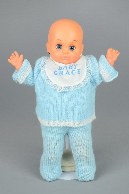 Poupée aux cheveux moulés. Elle porte un bavoir blanc orné de dentelle et d’une inscription bleue en majuscule. En dessous, il y a un chandail en tricot bleu avec bordures blanches. Elle porte un pantalon de tricot bleu avec pieds intégrés. Le corps, hormis la tête, les bras et les jambes, est constitué de coton blanc rembourré. Les yeux se ferment lorsqu’elle est couchée. Les lèvres sont peintes en rose.
