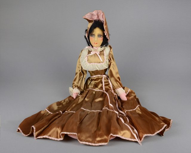 Poupée aux cheveux noirs coiffée d’un bonnet brun et rose orné de fleurs roses. Elle porte une robe brune de la même matière que le chapeau, ornée de dentelle et de rubans roses. Elle porte une longue culotte brune de la même matière également, cousue au corps, sous sa robe. Les yeux sont peints en brun, blanc et noir. Les lèvres sont peintes en rouge.