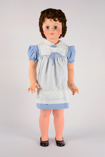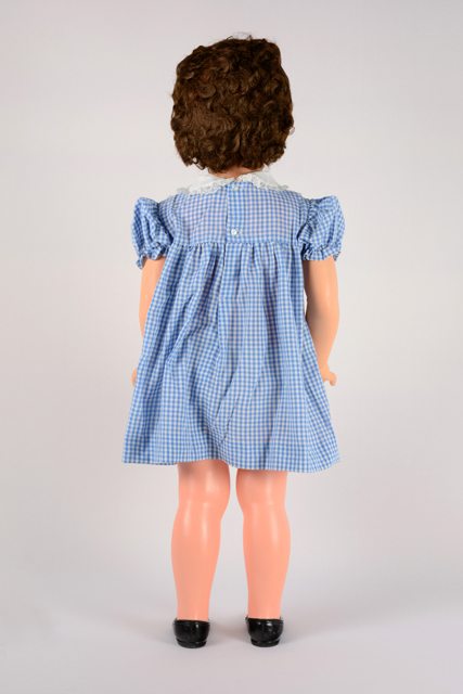Poupée fille portant une robe à carreaux blancs et bleus avec inscription brodée à l’avant, au bas de la robe. À droite de l’inscription est brodée une maison. Elle porte une petite culotte blanche. Les yeux bleus de la poupée se ferment lorsqu’elle est couchée (yeux dormeurs). Les lèvres et les joues sont rouges, les cheveux bruns courts bouclés. Les bras et les jambes sont articulés. La poupée a aux pieds des chaussures noires amovibles.