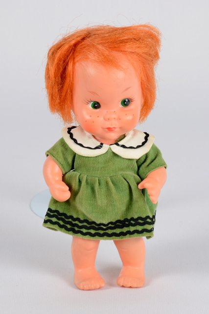 Poupée fille aux cheveux roux, aux yeux peints en vert, au visage avec des taches de rousseur et aux lèvres rouges. La robe de velours vert est bordée de rubans noirs et a un col blanc. Les bras et les jambes sont articulés.