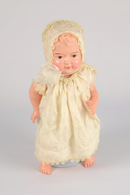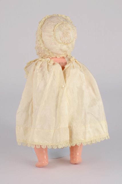 Poupée sous la forme d’un bébé vêtu d’un ensemble de baptême. Il est composé d’une robe en soie blanche avec des bordures en dentelle aux manches, au collet et au bas de la robe. Elle a aussi un petit bonnet en dentelle blanche, un jupon et une culotte. Les lèvres de la poupée sont peintes en rouge, les yeux en noir et les sourcils en brun.