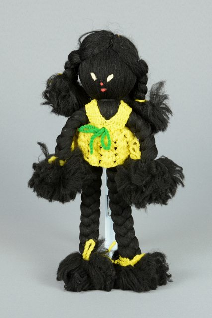 Poupée en fibre noire (laine ?) ayant pour tête une boule de mousse de polystyrène recouverte de fibre noire. Une robe en fibre jaune attachée à la taille avec un cordon vert. Les jambes et les bras sont tressés. Les traits du visage sont faits de deux pièces de tissu blanches et de deux pièces de tissu rouges.