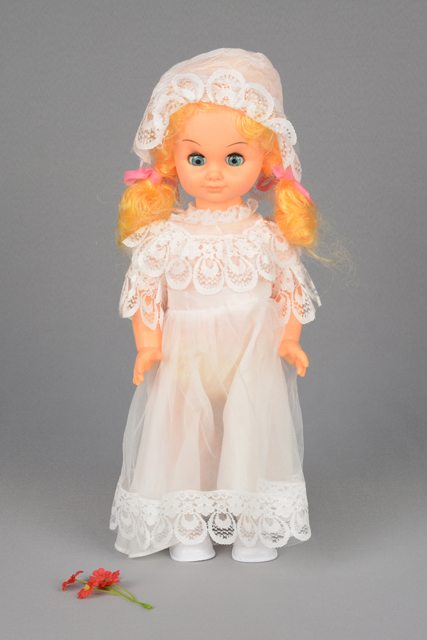 Poupée aux cheveux blonds longs attachés en couette de chaque côté par des rubans roses. La robe blanche est ornée de dentelle blanche. Elle porte un chapeau blanc en dentelle, une petite culotte jaune, des bas blancs et des souliers blancs en plastique. Elle a plusieurs trous sur le ventre et un bouton situé en dessous des trous au niveau du nombril. Un bouquet de fleurs en plastique vert et rouge accompagne la poupée. Dans le dos, il y a un emplacement pour insérer une pile et un petit panneau avec levier. Les yeux en bleu, noir et blanc se ferment lorsqu’elle est couchée. Les lèvres sont peintes en rose.