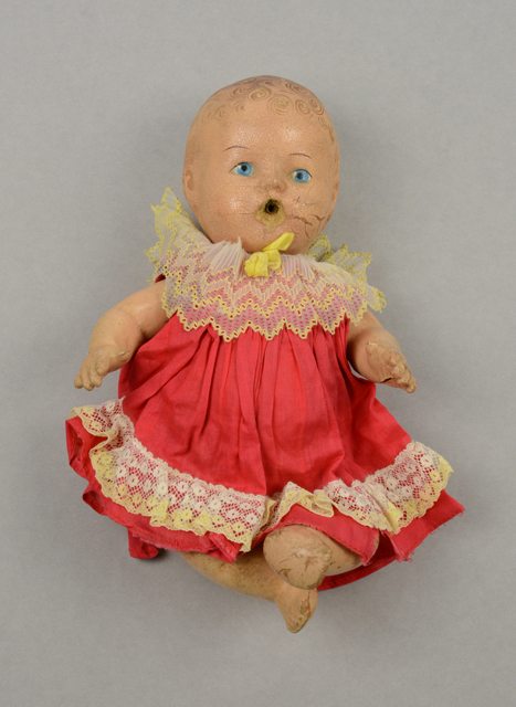 Poupée en plâtre de type composite. La robe est rouge avec de la dentelle blanche et jaune au col et au bas. Les yeux sont peints en bleu, les cheveux sont moulés et peints châtains. Un embout de métal se trouve à la bouche, ainsi qu’aux fesses.