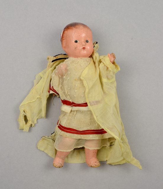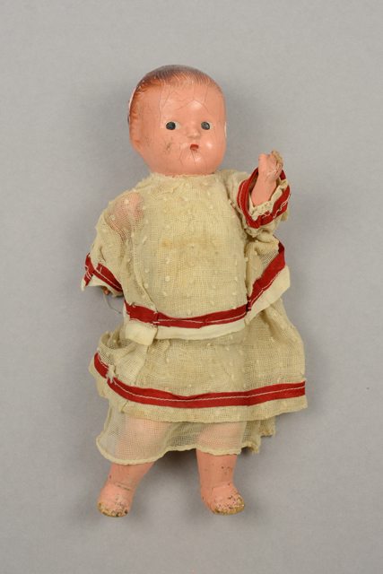 Poupée à la tête, aux avant-bras et aux jambes en matériau composite beige et le reste du corps en bourre recouvert d’un tissu beige. Le sous-vêtement, le jupon, la robe et la chemise sont en tissu ajouré beige avec des bordures rouges. La chemise de nuit est en tissu jaune avec des bordures noires et une insertion de dentelle beige à la poitrine. Les cheveux font partie du moulage de la poupée et ils sont peints bruns. Les yeux et les traits du visage sont peints.