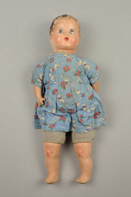 Poupée à la tête, aux avant-bras et aux jambes en matériel de type composite peint. Le corps est composé de tissu rembourré de chiffon. Les yeux sont peints en bleu et noir, la bouche en rouge et les cheveux en brun foncé. La poupée porte une robe bleue à motifs de fleurs et de moutons. La robe est retenue à la poupée par une épingle de sûreté.