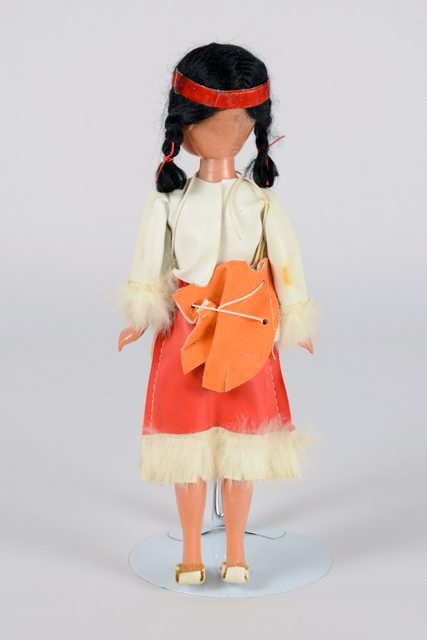 Poupée fille en plastique vêtue d’un costume amérindien en cuirette. Le costume comprend une jupe rouge sertie de perles décoratives en verre à l’avant, une bordure blanche et un rang de fourrure blanche. La poupée porte une chemise blanche avec un corsage blanc bordé de fourrure blanche et des insertions de perles en verre à la poitrine. Les mocassins sont blancs. Ses cheveux sont noirs en fils de coton et sont coiffés en deux tresses avec un bandeau rouge en cuirette suédée rouge serti de perles en verre.