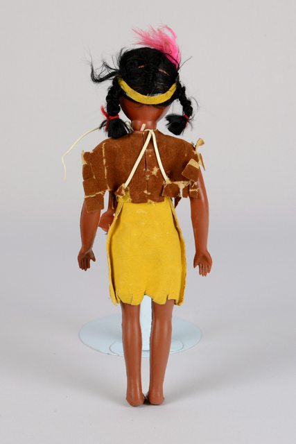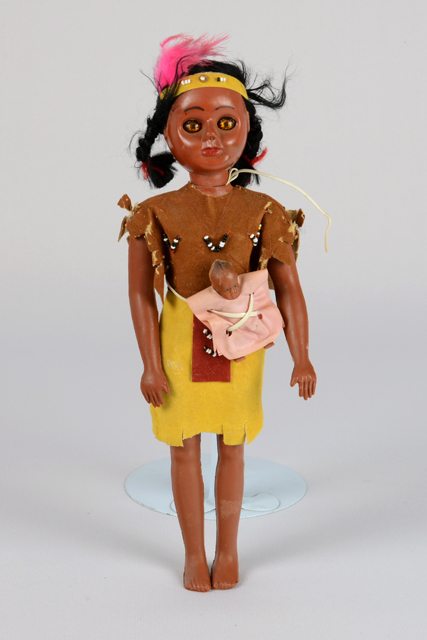 Poupée fille à la peau foncée vêtue d’un costume de style amérindien en cuirette. La jupe est jaune avec une ceinture rouge descendante sertie de perles en verre. Le corsage est brun avec trois décorations de perles. Ses cheveux sont noirs en fils de coton et ils sont coiffés en deux tresses. La poupée porte un bandeau jaune décoré de perles et une plume rose. Elle porte son bébé dans un porte-bébé rose maintenu sur le ventre par des attaches blanches.
