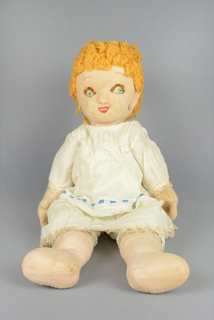 Poupée aux cheveux blonds. Elle porte une robe blanche ornée de dentelle et d’un ruban de velours bleu par-dessus un jupon blanc également orné de dentelle. Elle porte une petite culotte blanche sous la robe et le jupon. Les bras et les jambes sont reliés au corps à l’aide de fils et de boutons. Les yeux sont brodés en bleu, blanc et brun. Les lèvres sont brodées en rose.