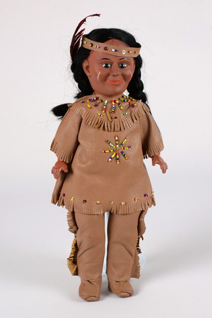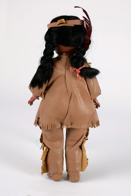 Poupée homme à la peau foncée vêtue d’un costume amérindien en cuir brun composé d’un pantalon frangé sur les côtés, d’une chemise frangée au bas, au bas des manches et au cou. La chemise est ornée de petites perles en verre multicolores à la poitrine et à l’encolure et des mocassins. Ses cheveux sont noirs coiffés en deux tresses. La tresse de droite est attachée par un ruban rose et est ornée d’une plume rouge. La tresse gauche n’est pas attachée.
