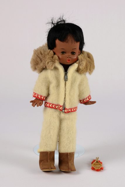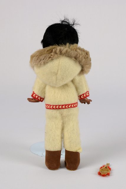 Poupée à la peau foncée vêtue d’un costume de style inuit en tissu laineux écru composé d’un pantalon, d’un manteau à capuchon bordé de broderies rouges au bas et aux poignets. Le capuchon est bordé de fourrure brune. Le manteau s’ouvre à l’avant avec une fermeture à glissière. Les bottes sont en cuirette brune. Ses cheveux sont noirs et courts. La raquette miniature est en bois avec des décorations en fibre rouge.