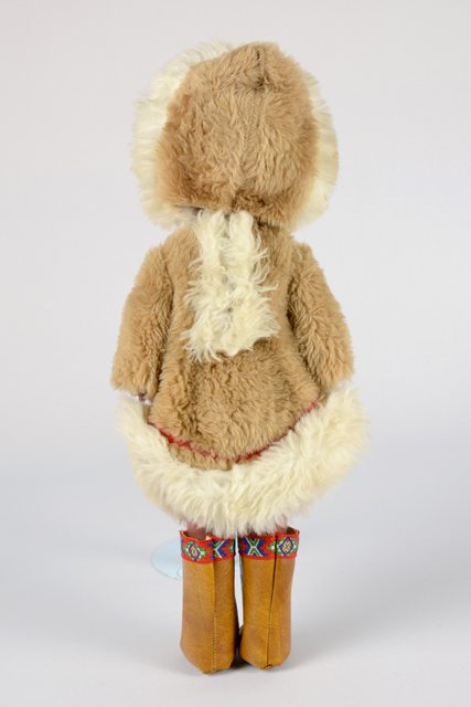 Poupée fille à la peau foncée vêtue d’un costume d’Inuit comprenant un manteau en fourrure synthétique brune avec des bordures en fourrure synthétique blanche qui se ferme avec des boutons-pression. La poupée est coiffée d’un capuchon en fourrure similaire au manteau et possède des mocassins en cuirette avec un motif de broderie rouge, blanc, vert et bleu au haut des bottes. Ses cheveux sont noirs et courts.