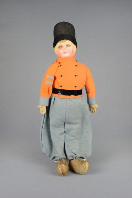 Poupée aux cheveux blonds coiffée d’un chapeau noir. Elle porte une veste à six boutons orange ainsi qu’un pantalon gris. Elle a des sabots bruns aux pieds. Les yeux sont peints en bleu, brun et noir. Les lèvres sont peintes en rose.