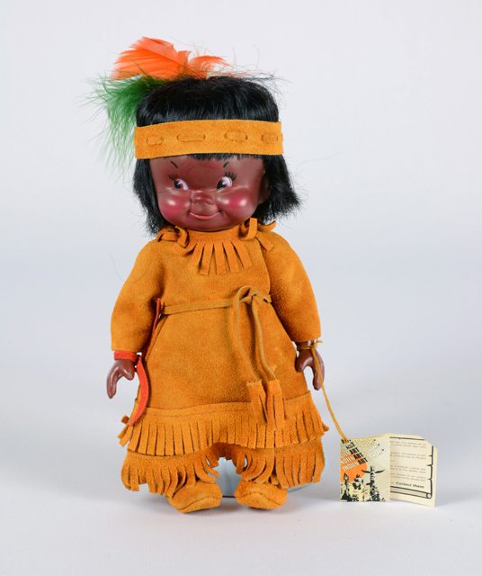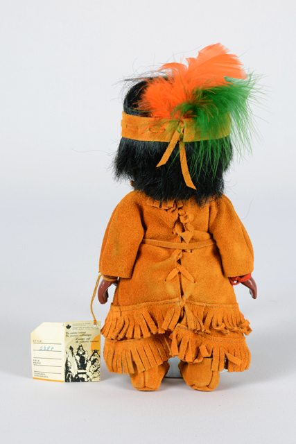 Poupée à la couleur de peau foncée, vêtue d’un costume amérindien en cuir orange composé d’une longue robe orange à double rang de franges au bas et au cou, une ceinture, un bracelet en cuir rouge, une culotte et des mocassins en cuir. Ses cheveux sont noirs en fibres synthétiques avec un bandeau en cuir orange avec à sa droite une plume orange et une verte. Une étiquette est attachée à son poignet gauche.