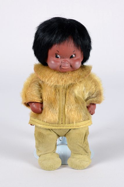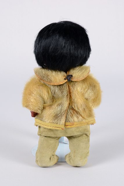 Poupée à la couleur de peau foncée, vêtue d’un costume de style inuit comprenant un pantalon à pieds intégrés en cuir suédé naturel et une veste en fourrure de phoque (loup marin, véritable ?) beige. Ses cheveux sont noirs en fibres synthétiques.