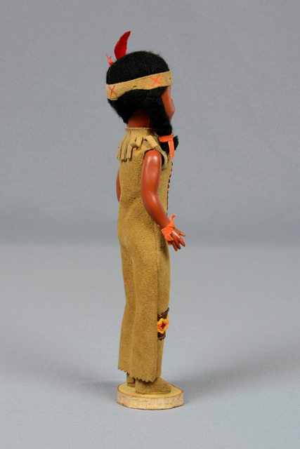 Poupée fille à la peau foncée vêtue d’un costume amérindien en cuir suédé. Le costume comprend une longue robe en chamois sans manches avec un col frangé. La robe a une décoration brune ornée de broderies en jaune et orangé. Ses cheveux sont noirs en fils de coton et ils sont coiffés en deux tresses attachées au ruban de cuir brun avec un bandeau en cuir suédé chamois et une plume rouge. Les souliers sont en cuir suédé. La poupée est fixée sur une base circulaire en bois. Les articles de vêtements sont collés sur la poupée.