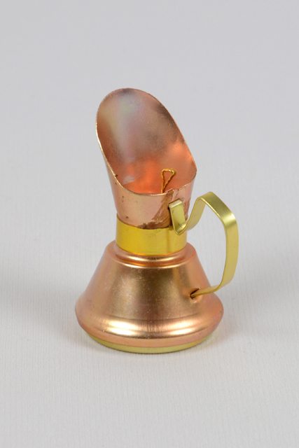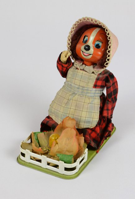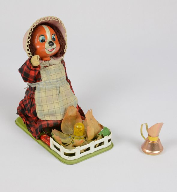 Petite poupée mécanisée sous la forme d’une jardinière à la tête de chien anthropomorphique. Elle est vêtue d’une robe carreautée en rouge et noir (écossaise ?), d’un tablier bleu et blanc et d’un capuchon rose aux bords de dentelle blanche. Le bras droit à la main brisée est en céramique blanche. Elle tenait à la main une carafe à eau en laiton. Elle se tient devant une fleur munie d’un luminaire. La poupée est solidaire du jardin sur sa base et ne peut être enlevée. Sur le côté gauche, devant la poupée se trouve un interrupteur rouge.