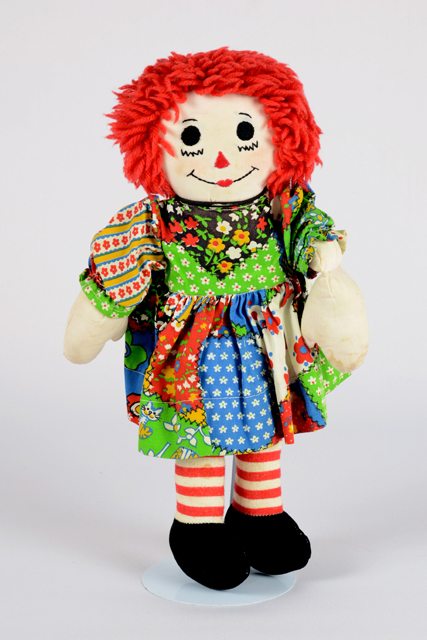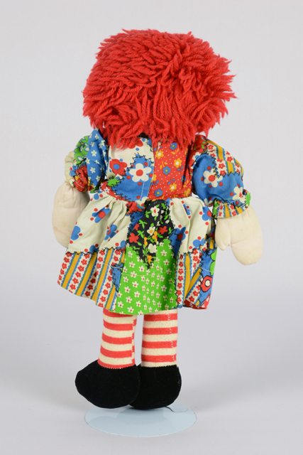 Poupée de chiffon fille aux cheveux de laine rouge et aux traits du visage brodés en laine noire et rouge. Le nez est formé d’un triangle rouge. La robe est à motifs verts, bleus, rouges, jaunes et blancs. Les jambes sont rayées horizontalement en rouge et blanc. Les chaussons sont noirs.