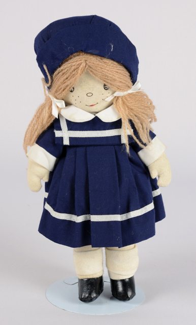 Poupée fille aux cheveux de laine beige, aux traits du visage peints avec des taches de rousseur. La robe d’écolière et le bonnet sont bleu marin à bordures blanches, les bas sont blancs et les chaussons en cuirette sont noirs. Derrière, un velcro permet d’attacher la robe.