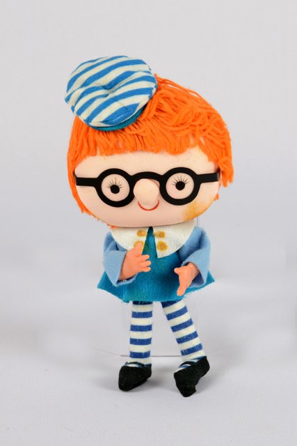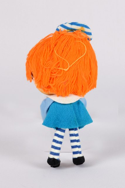 Poupée fille aux cheveux de laine orange, la tête rembourrée de mousse recouverte de tissu, aux lunettes noires. La casquette et les collants sont rayés en blanc et bleu. Le corps est en broche recouvert de feutrine. La robe est bleue et les chaussons noirs.