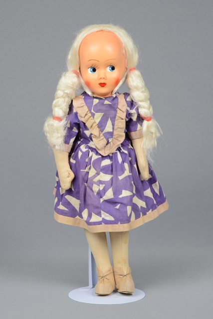 Poupée fille aux cheveux blancs attachés en deux tresses avec des élastiques à cheveux rouges. La tête de la poupée est en plastique et les traits du visage sont peints : les yeux sont en bleu, blanc et noir, les lèvres et les joues sont rouges. Le corps de la poupée est en tissu rembourré bleu marin et beige. La robe est en tissu mauve ornée de motifs géométriques blancs et une bordure blanche aux manches et en bas de la robe. Le jupon et la culotte sont en tissu blanc. Les souliers sont cousus aux pieds et sont faits d’un tissu beige et d’une semelle en carton beige.