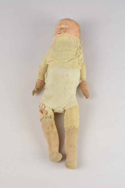 Poupée de chiffon avec tête et mains en plâtre peint. Elle est habillée de vêtements faits avec des guenilles. Une épingle de sûreté semble retenir la jambe droite au corps de la poupée. Du ruban adhésif se trouve sur la tête de la poupée.