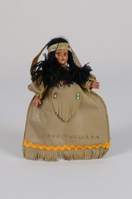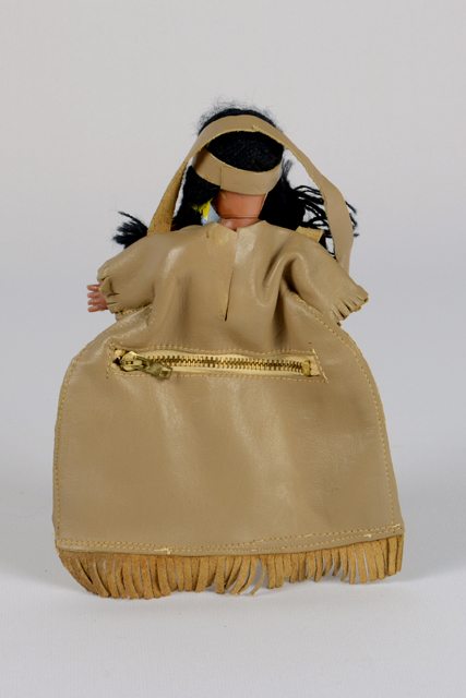 Poupée fille à la peau foncée de style amérindien avec une robe ample avec des perles en verre fixées sur la poitrine et une fermeture à glissière au dos pour y ranger de la monnaie. La robe est en cuir brun et est frangée au bas et aux manches. La poupée a les cheveux noirs coiffés en tresses. Elle porte un bandeau en cuir brun orné de perles. La bandoulière est fixée aux épaules de la robe.