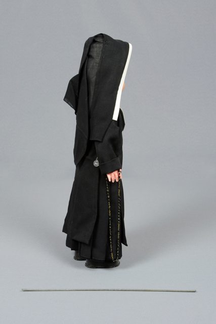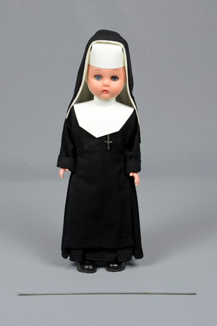 Poupée vêtue d’un costume de religieuse composé d’une robe noire avec un voile noir et d’une cornette blanche et d’un chapelet attaché à la taille. La poupée a des souliers noirs. Les lèvres sont roses et ses yeux bleus. Les yeux se ferment lorsque la poupée est couchée. Une tige de métal presque aussi grande que la poupée est associée à l’objet. La robe est épinglée à certains endroits.