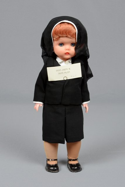 Poupée vêtue d’un costume de religieuse. Elle est vêtue d’un tailleur noir avec un chemisier blanc, un voile noir au bord blanc et des bas de soie beiges. Les lèvres sont roses et ses yeux bleus. Les yeux se ferment lorsque la poupée est couchée. Sur le chemisier est épinglé un petit carton avec une inscription.
