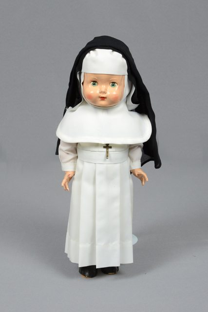 Poupée féminine portant un costume de religieuse composé d’une robe blanche, d’un voile noir et blanc, d’une croix portée au cou, des bas blancs et des bottines noires à semelles de cuir. La robe est épinglée à la poupée à certains endroits.