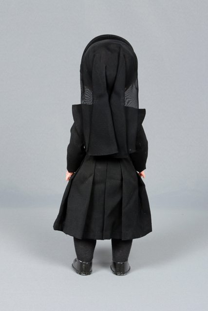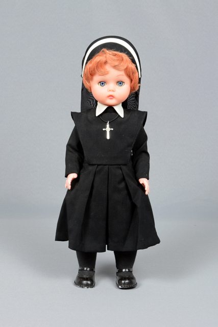 Poupée portant un costume de religieuse composé d’une robe noire à col blanc, d’un voile noir à bordure blanche, de bas noirs et de souliers noirs. Elle porte une croix au cou. Ses cheveux sont roux, ses lèvres roses et ses yeux bleus. Les yeux se ferment lorsque la poupée est couchée.
