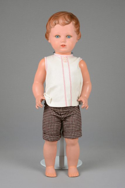 Poupée aux yeux bleus et aux cheveux ondulés faisant partie du moulage de la tête et peints en brun. Les lèvres sont peintes en rouge. À la nuque et entre les omoplates, on retrouve un logo embossé d’une tortue dans un losange. La poupée porte un chandail blanc avec des insertions de broderie rose et des boutons beiges sur le devant et une fermeture à glissière à l’arrière. Elle porte aussi un pantalon court à carreaux gris aux lignes rouges et bleues.