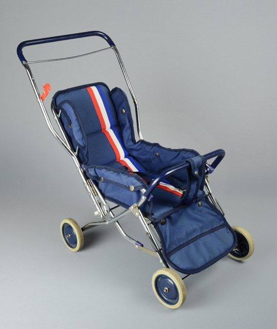 Poussette pour poupée repliable avec un corps en métal luisant. Le siège est en tissu bleu et est attaché au corps de la poussette par des boutons-pression en métal. Un motif composé de trois lignes, une bleue, une blanche et une rouge, est cousu sur le long de l’intérieur du siège. Les roues sont en caoutchouc blanc avec les rayons noirs.